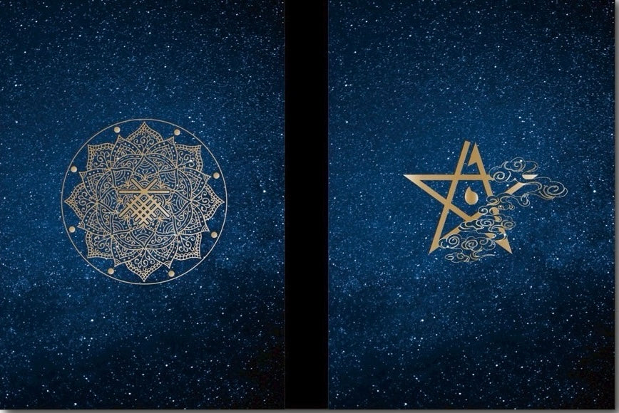 表紙に描かれた曼荼羅は星々が巡る宇宙の秩序を、そして右面の五芒星は橋本家独自の“導きの星”として、持つ人の願いを正しく照らす役目を担います。