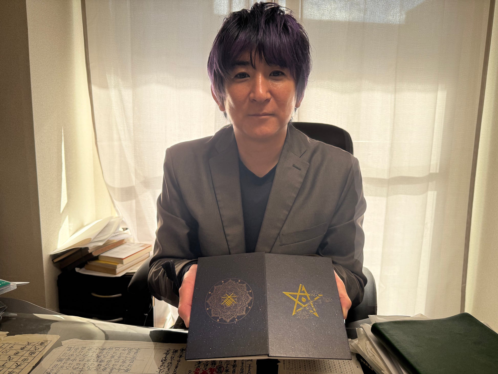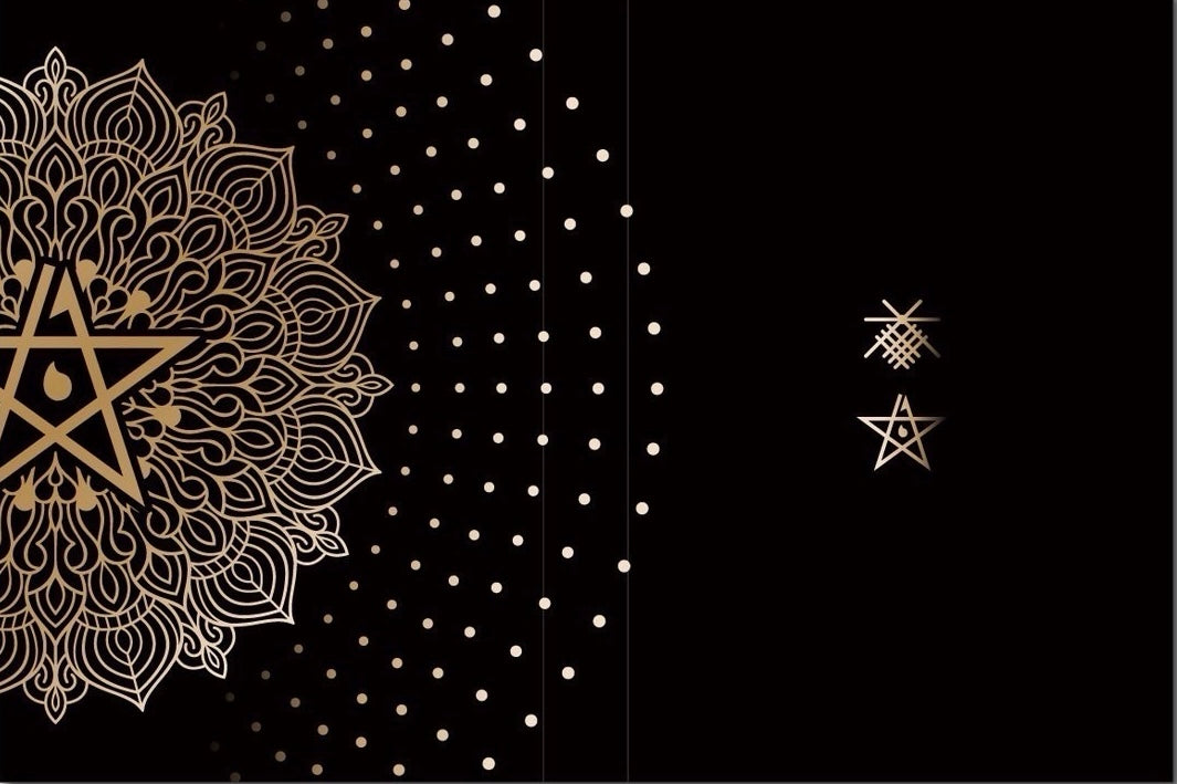 深い闇を思わせる黒の世界に、金色の紋様が静かに輝く──このご朱印帳は、内なる祈りと光を象徴する一冊です。左面の曼荼羅は、清浄な“気”が四方へ満ち広がる様を表し、中心の橋本家独自の五芒星は邪気を祓い、願いを導く護符としての力を宿します。